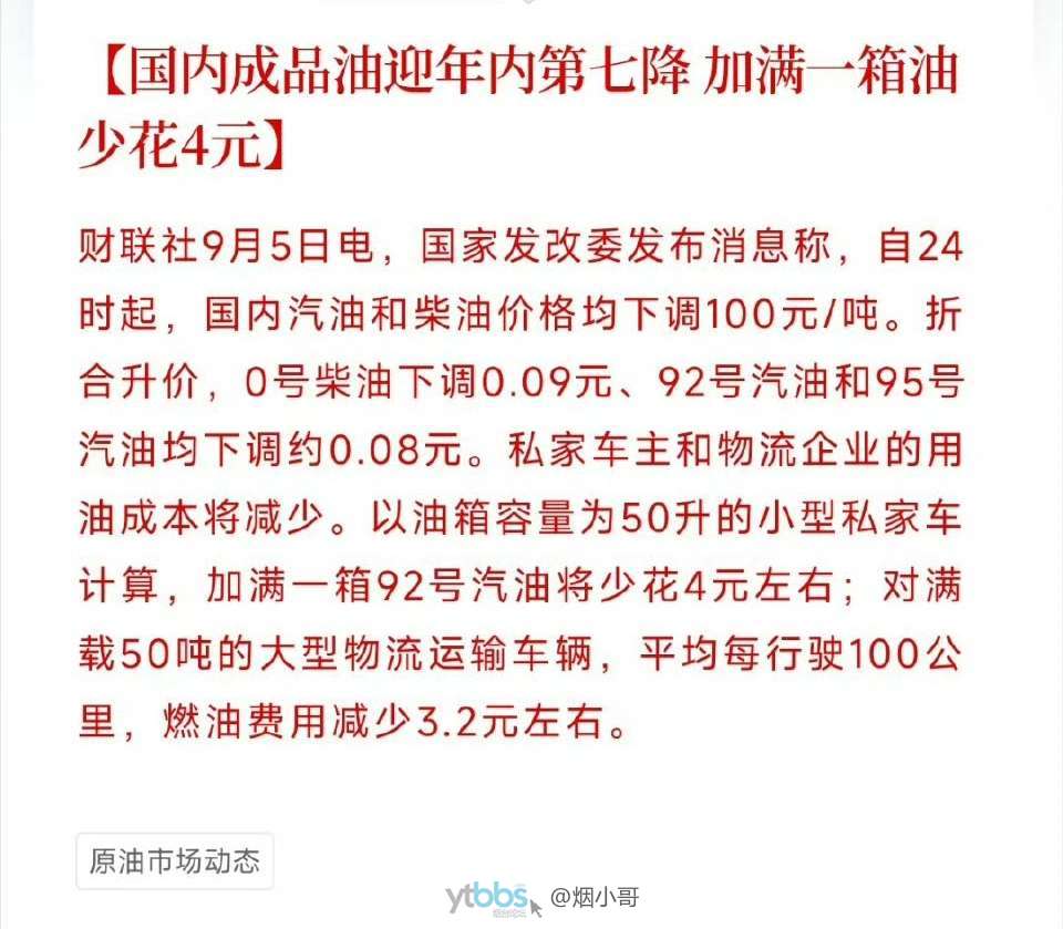 9ÔÂ5ÈÕ£¬¹ú¼Ò·¢¸Äί·¢²¼ÏûÏ¢³Æ£¬×Ô24ʱÆð£¬¹úÄÚÆûÓͺͲñÓͼ۸ñ¾ùϵ÷100Ôª/¶Ö¡£ÕÛºÏÉý¼Û£¬0ºÅ²ñÓÍϵ÷0.09Ôª¡¢92ºÅÆûÓͺÍ95ºÅÆûÓ;ùϵ÷Ô¼0.08Ôª¡£